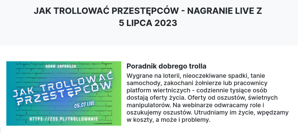 W lipcu 2023 r. Adam Haertle (Zaufana Trzecia Strona) przeprowadził webinar pt. „JAK TROLLOWAĆ PRZESTĘPCÓW„: