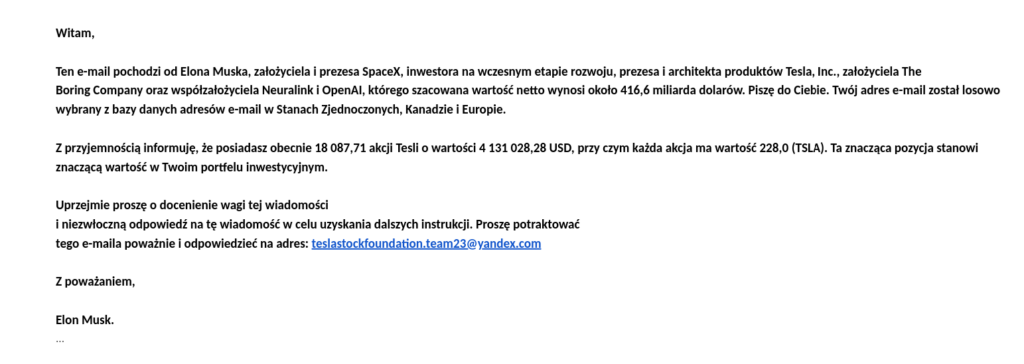 Wiadomość informuje o „losowym wyborze” adresu e-mail i przypisaniu do niego ponad 18 tysięcy akcji Tesli o wartości przekraczającej 4 miliony dolarów. Nadawca prosi o pilny kontakt na adres w domenie Yandex w celu „uzyskania dalszych instrukcji”.