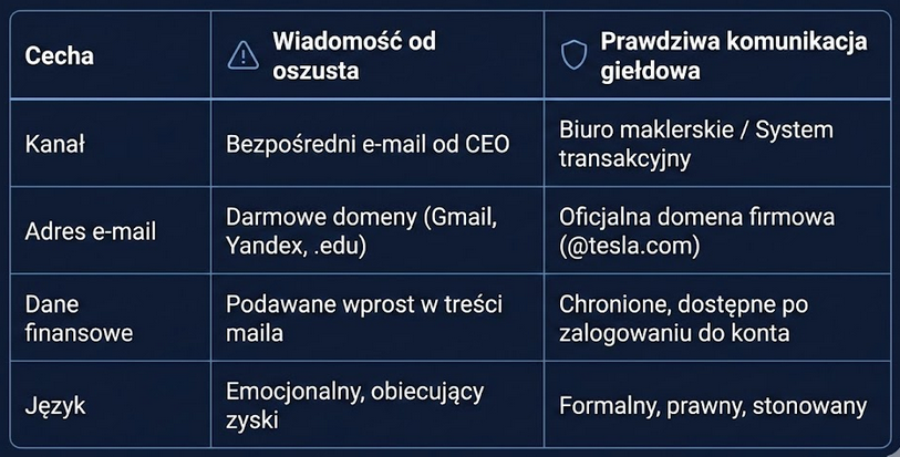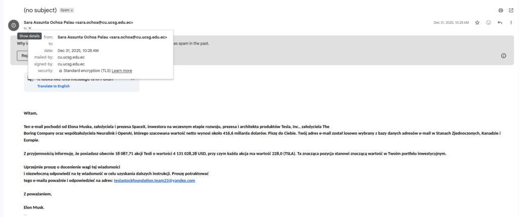- Fakt: Elon Musk ani żadna z jego spółek (Tesla, SpaceX, X) nie prowadzi korespondencji inwestycyjnej za pośrednictwem akademickich kont e-mail z Ameryki Południowej. W analizowanej wiadomości adres nadawcy wskazuje na domenę instytucjonalną, co może oznaczać wykorzystanie legalnej infrastruktury pocztowej (np. konta instytucjonalnego), często spotykane w kampaniach spamowych i phishingowych.