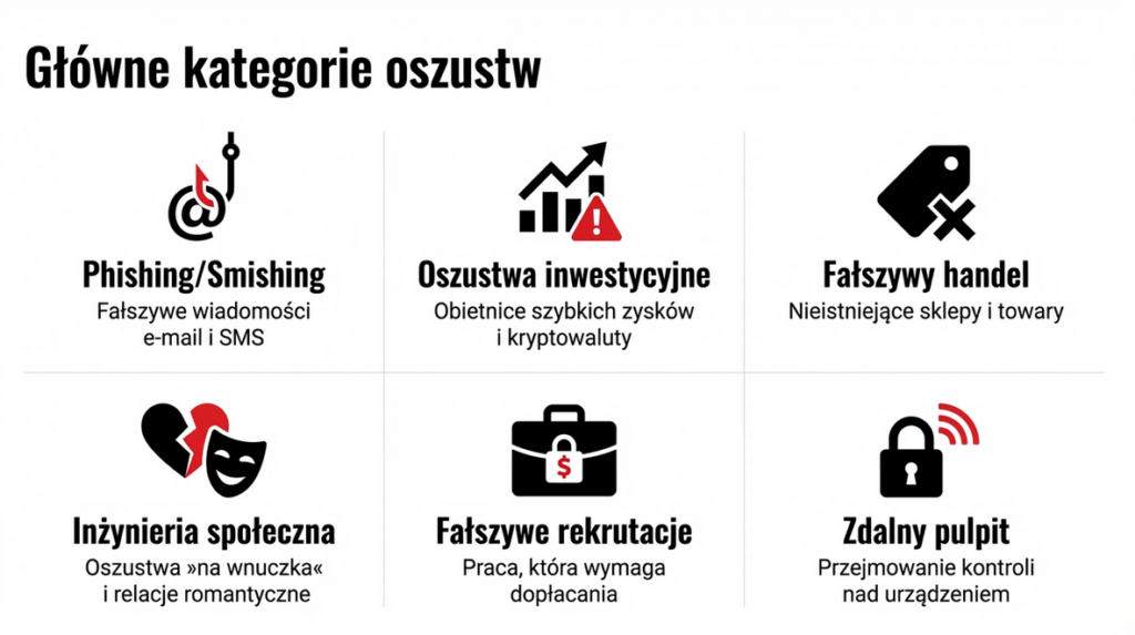 • Phishing – fałszywe e-maile, SMS-y, komunikaty „z banku”, „z urzędu”, „od dostawcy energii”, „z poczty”, „od kuriera”.