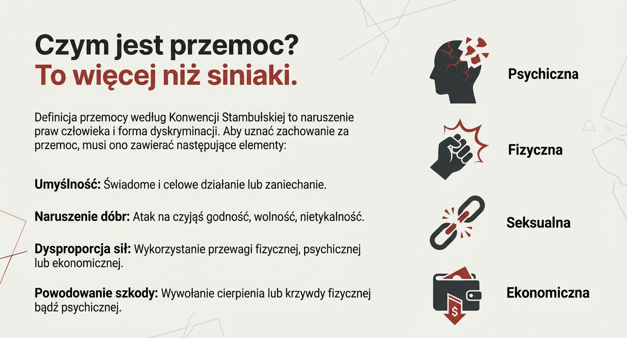 • psychicznej, fizycznej, seksualnej i ekonomicznej (w ujęciu Konwencji Stambulskiej),