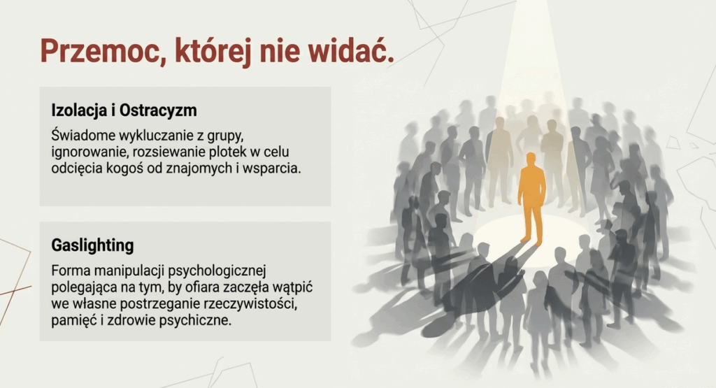 • izolacja, wykluczenie i ostracyzm (w tym tzw. „cicha przemoc” i gaslighting),