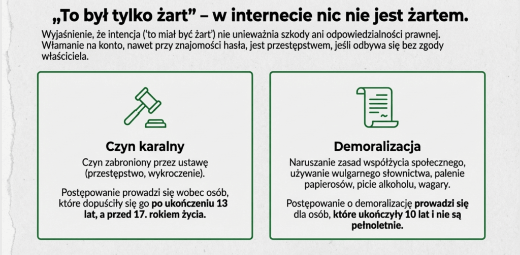 • najczęściej naruszanymi przez młodzież przepisami (m.in. groźby karalne, stalking, mowa nienawiści, zniesławienie i zniewaga),
