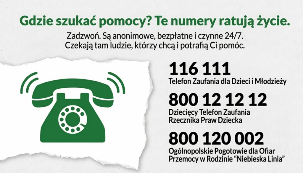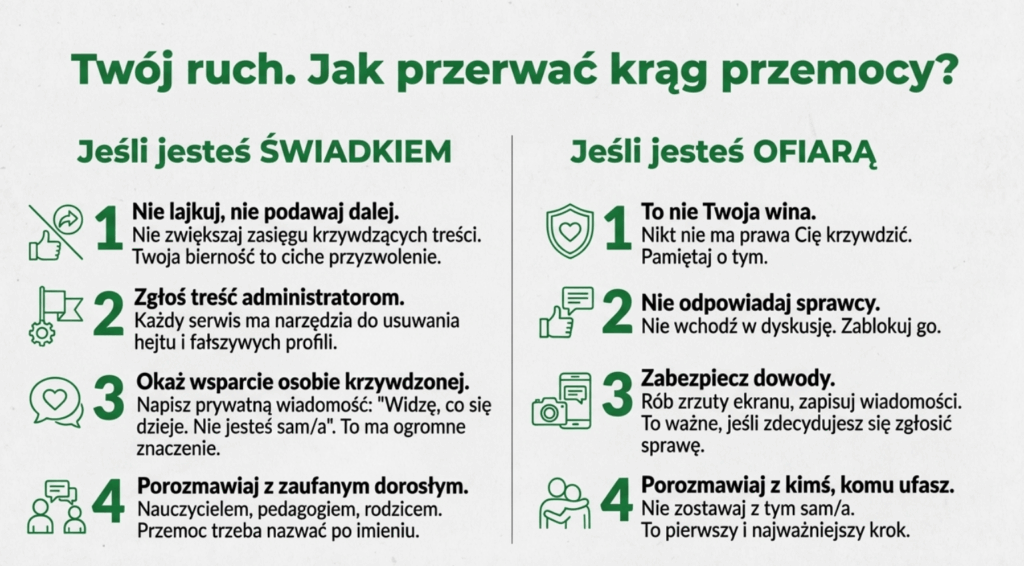 • gdzie i jak zgłaszać przemoc (szkoła, organy ścigania, Dyżurnet, Rzecznik Praw Dziecka),