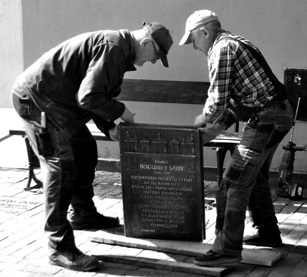 Tablica została ufundowana przez miasto Zamość z inicjatywy Ewy Dąbskiej. Pod petycją w tej sprawie podpisało się około 1,5 tysiąca zamościan i osób w różny sposób związanych z miastem. Zawisła ona w tym dokładnie miejscu, które lata wcześniej wskazał wybitny historyk kultury i sztuki o nieocenionych zasługach dla Zamościa, prof. Jerzy Kowalczyk, pisząc: „Na elewacji bocznej kamienicy należy umieścić na parterze napis upamiętniający nazwisko fundatorki, dr Bogumiły Sawy”.