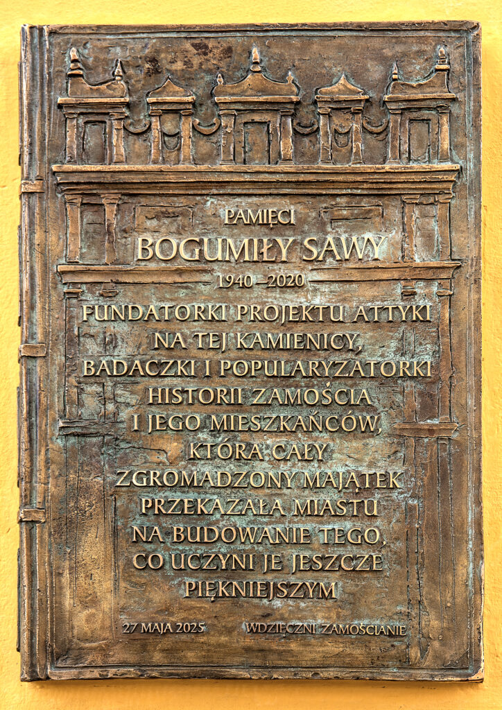 W piątą rocznicę śmierci Bogumiły Sawy na kamienicy przy Rynku Wielkim 5a (dawnym Domu Pańskim) zamocowana została tablica poświęcona Bogumile Sawie. Stało się to dokładnie w 5. rocznicę jej śmierci, 27 maja 2025 roku. Bogumiła Sawa ufundowała projekt attyki zrekonstruowanej na tej właśnie kamienicy w 2006 roku. Napis na tablicy w formie księgi, zaprojektowanej przez zamojskiego artystę rzeźbiarza Bartłomieja Sęczawę, przypomina także, że Bogumiła Sawa była badaczką i popularyzatorką historii Zamościa i jego mieszkańców oraz że cały zgromadzony majątek przekazała miastu „na budowanie tego, co uczyni je jeszcze piękniejszym”. Testament był jej najhojniejszym z wielu darów dla miasta, wśród których było także przekazanie największej sumy spośród wszystkich sponsorów na budowę pomnika Jana Zamoyskiego. By ten pomnik zobaczyć, wystarczy stojąc na ulicy Grodzkiej przed tablicą, odwrócić głowę w kierunku pałacu Zamoyskich.